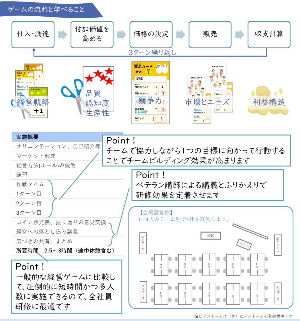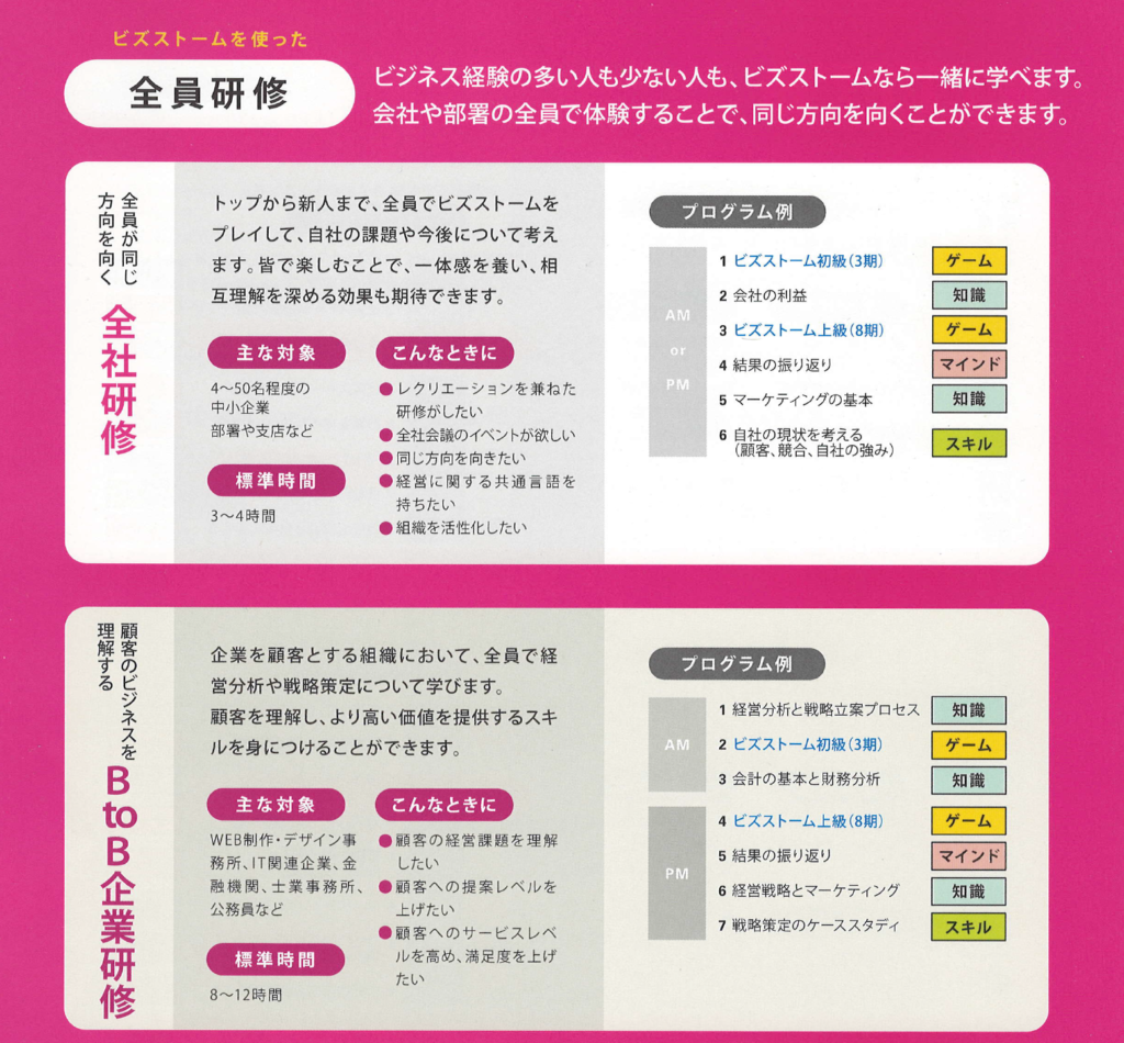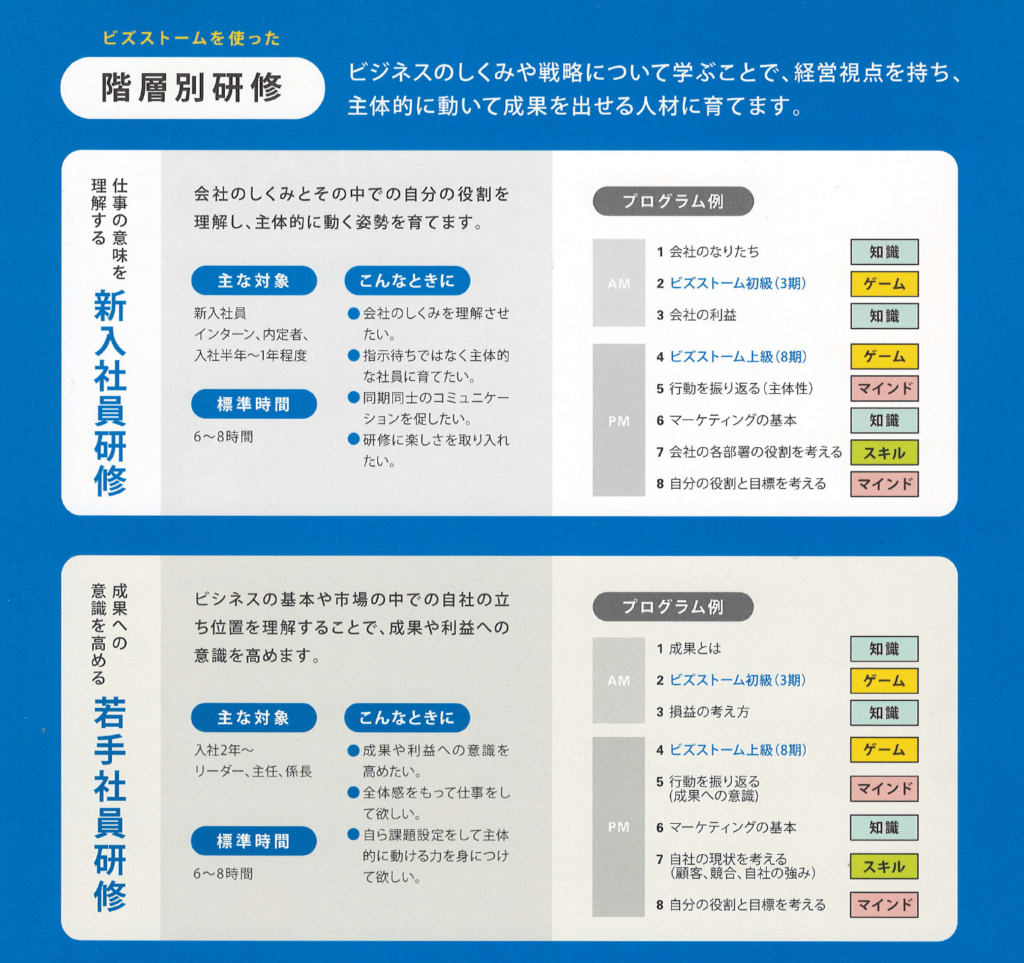 ビズストームよりも短時間で多人数にビジネスの基礎を学んでもらえる仕組みになっているため、人数の多い企業の全社員研修などにもご利用いただけます。